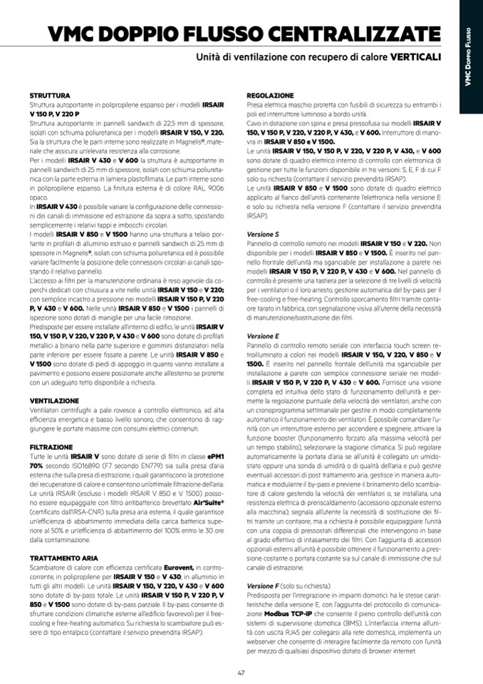 tutti gli altri modelli. Le unità IRSAIR V 150, V 220, V 430 e V 600