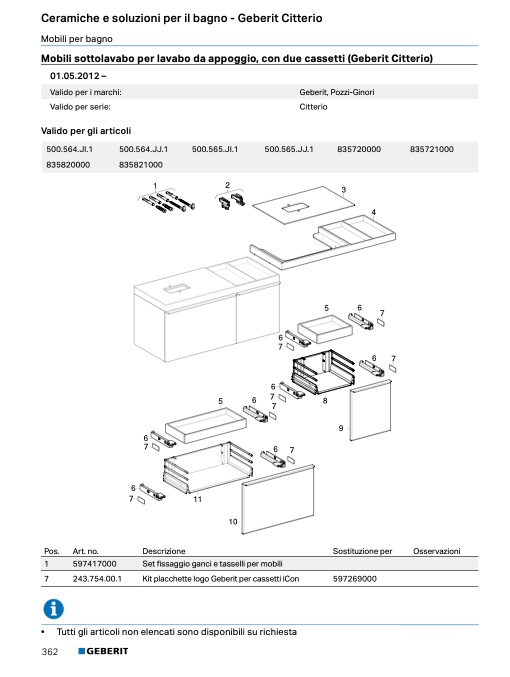 Mobili sottolavabo per lavabo da appoggio, con due cassetti (Geberit Citterio)
