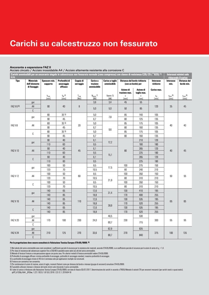 9) I valori di carico si riferiscono alla Valutazione Tecnica Europea ETA-05/0069, con data di rilascio 03/07/2017. Determinazione dei carichi in accordo a TR055/Metodo di calcolo ETA per ancoranti meccanici (per carichi statici e quasi-statici).