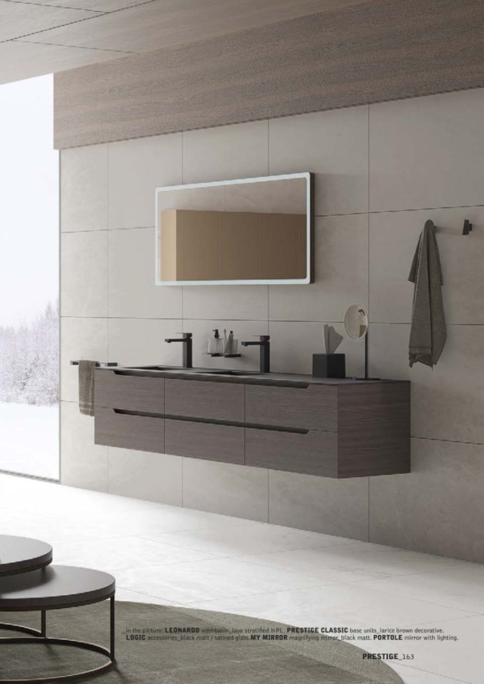 _in the picture: LEONARDO washbasin_lava stratified HPL. PRESTIGE CLASSIC base units_larice brown decorative.