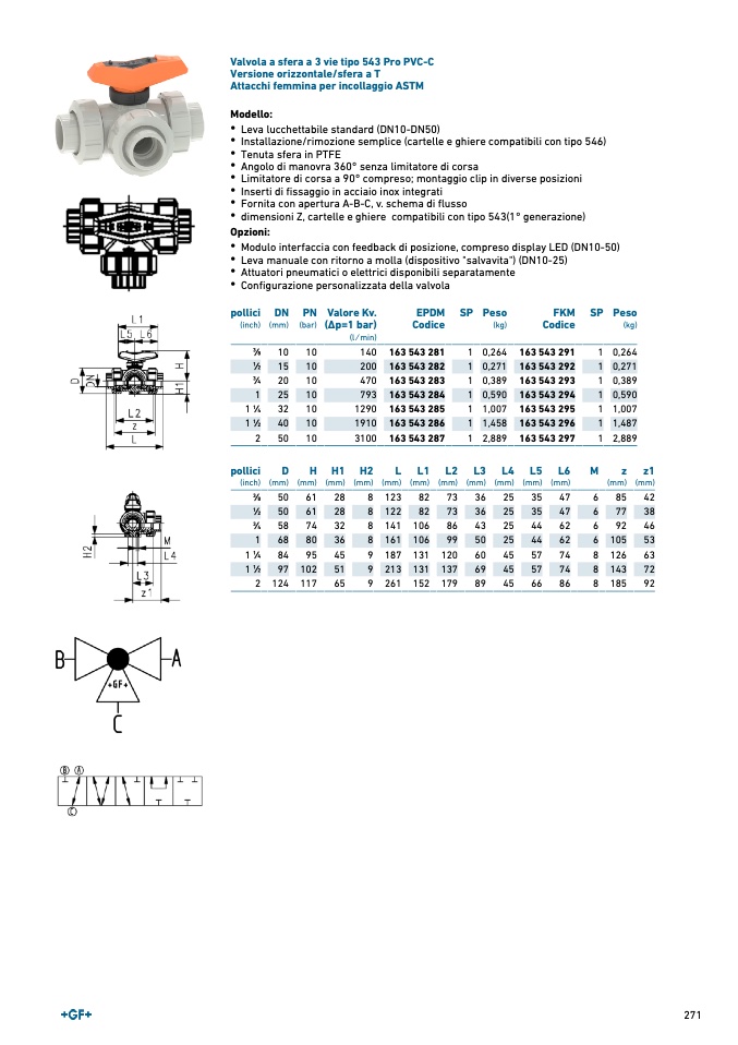 Valvola a sfera a 3 vie tipo 543 Pro PVC-C