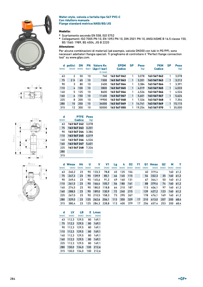 Wafer-style, valvola a farfalla tipo 567 PVC-C