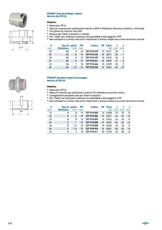 Attacchi maschio per polifusione metrico e BSP e filettatura femmina cilindrica, rinforzata
