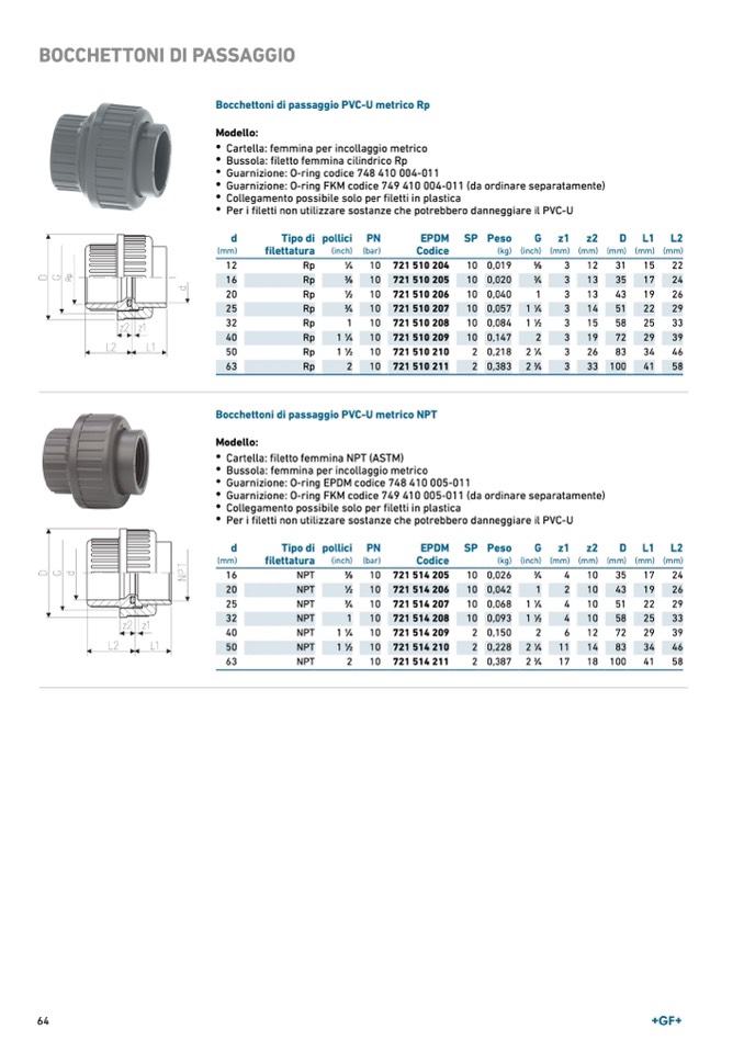 Bocchettoni di passaggio PVC-U metrico NPT