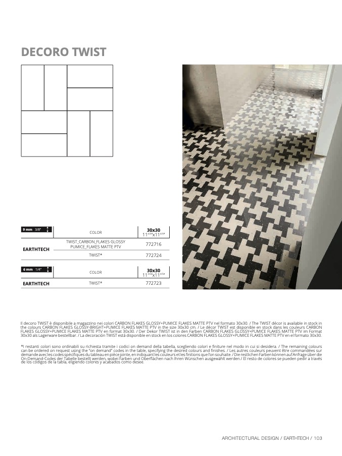 30x30 als Lagerware bestellbar. / La decoración TWIST está disponible en stock en los colores CARBON FLAKES GLOSSY+PUMICE FLAKES MATTE PTV en el formato 30x30.