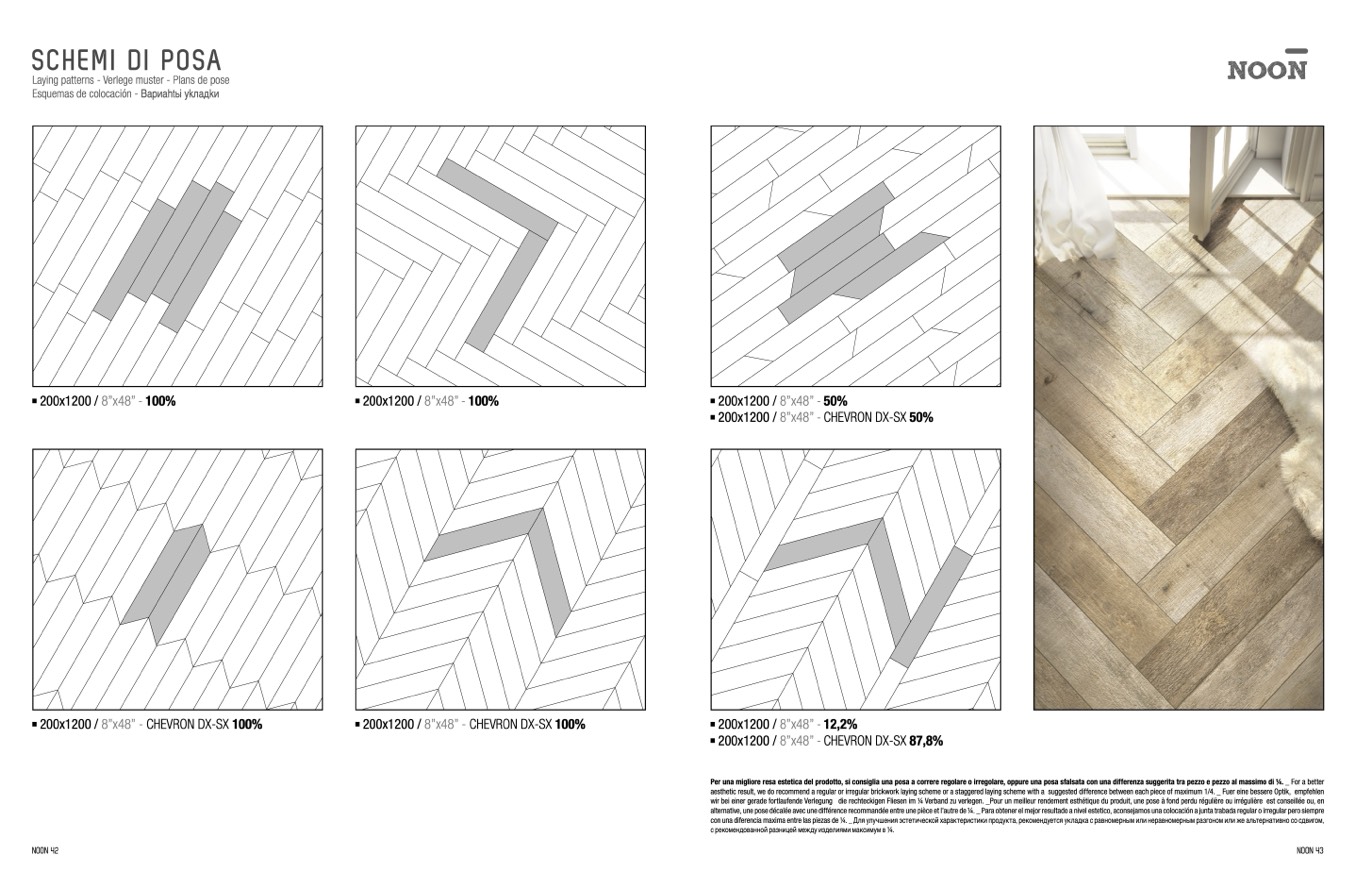 alternative, une pose décalée avec une différence recommandée entre une pièce et l’autre de 1⁄4. _ Para obtener el mejor resultado a nivel estetico, aconsejamos una colocaci