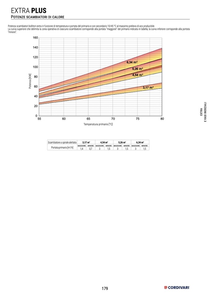 Potenza scambiatori bollitori extra in funzione di temperatura e portata del primario e con secondario 10/45 °C al massimo prelievo di acs producibile.
