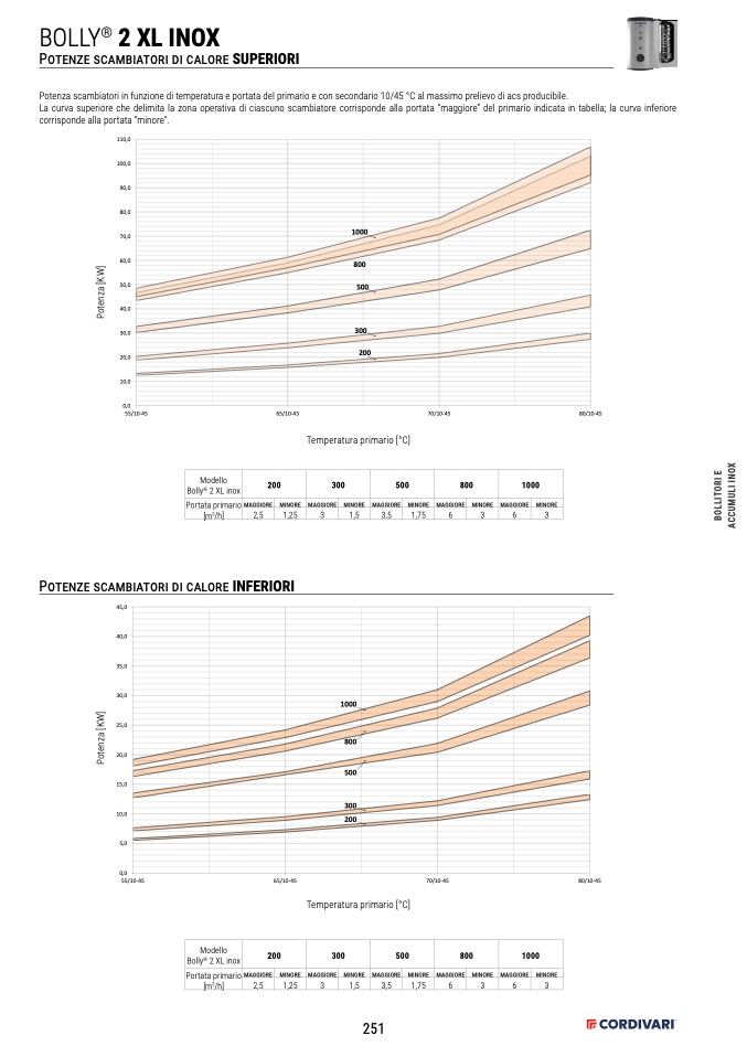 La curva superiore che delimita la zona operativa di ciascuno scambiatore corrisponde alla portata “maggiore” del primario indicata in tabella; la curva inferiore
