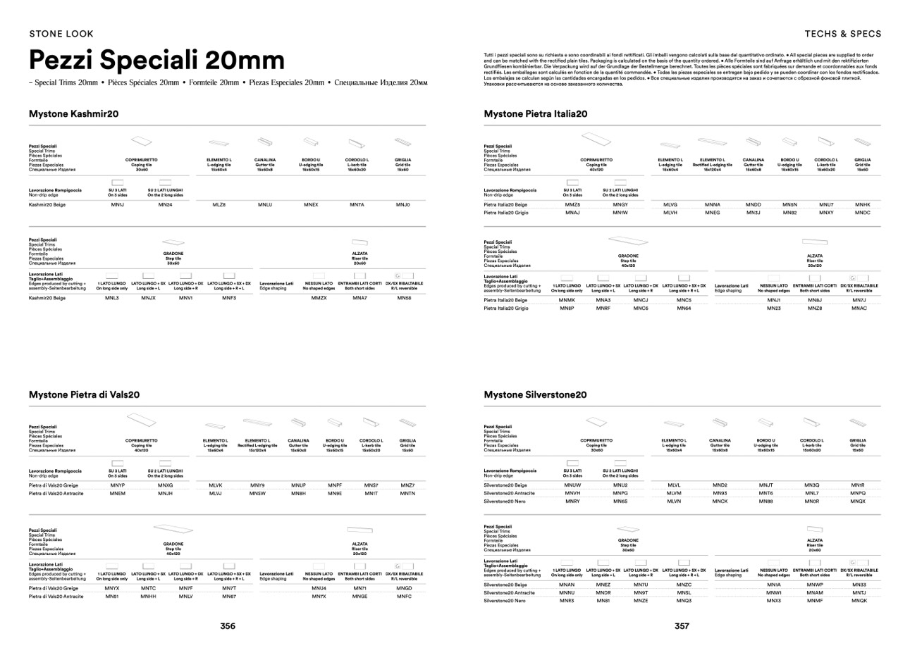 Tutti i pezzi speciali sono su richiesta e sono coordinabili ai fondi rettificati. Gli imballi vengono calcolati sulla base del quantitativo ordinato. • All special pieces are supplied to order