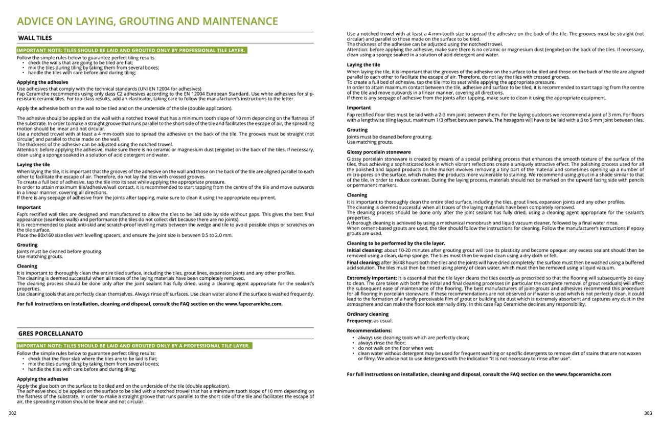 For full instructions on installation, cleaning and disposal, consult the FAQ section on the www.fapceramiche.com.