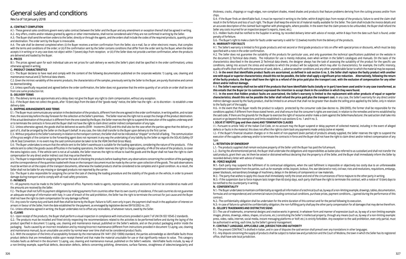 G.1.- Upon receipt of the products, the Buyer shall perform a visual inspection in compliance with instructions provided in point 7 of UNI EN ISO 10545-2 standards.