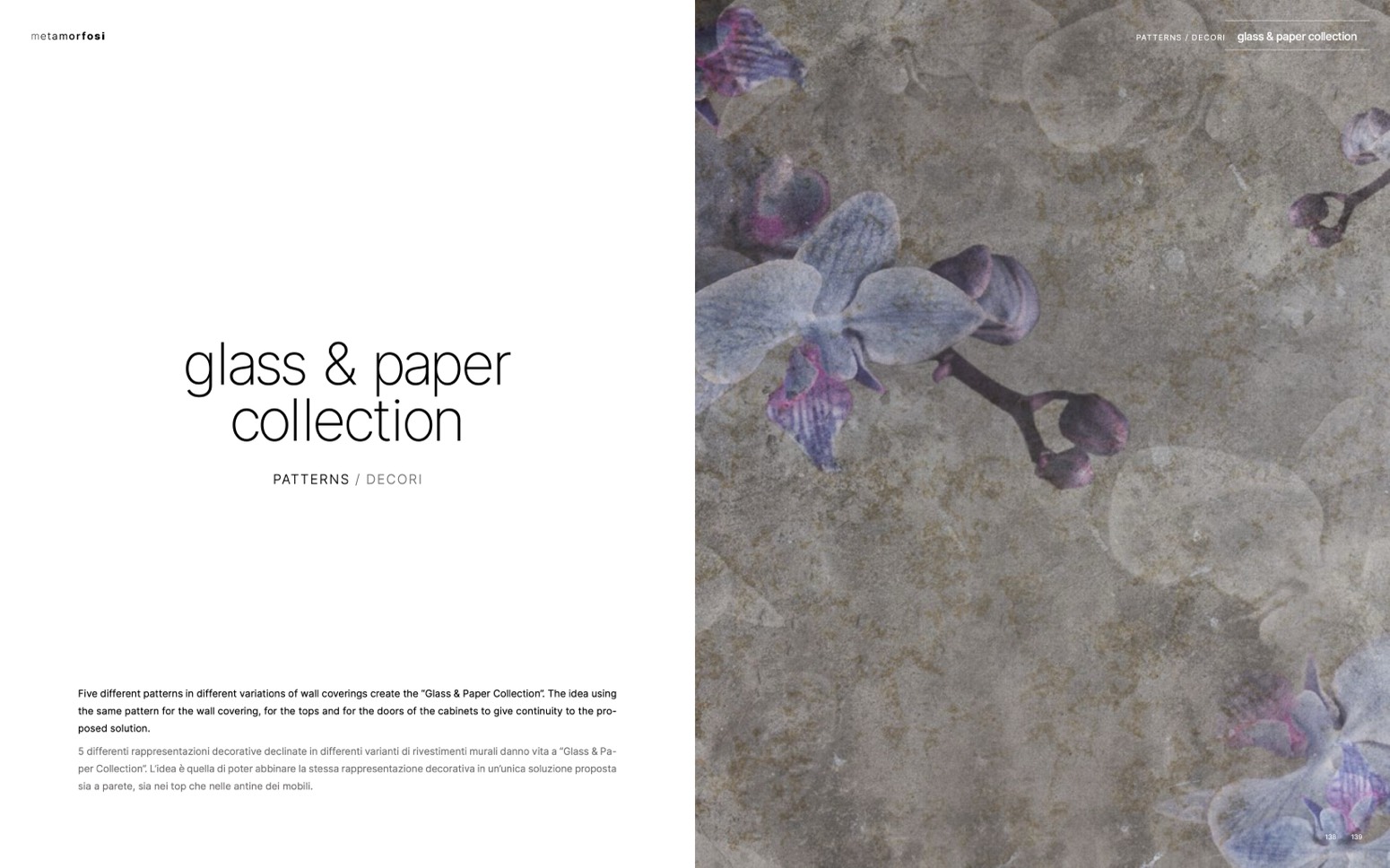 5 differenti rappresentazioni decorative declinate in differenti varianti di rivestimenti murali danno vita a “Glass & Pa-