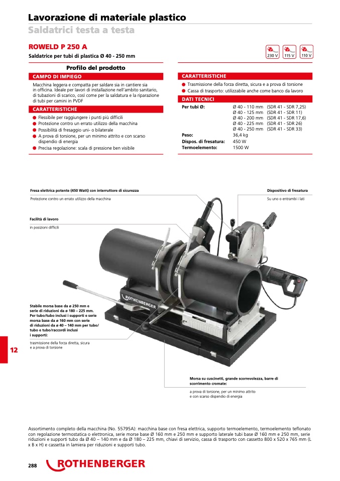 riduzioni e supporti tubo da Ø 40 – 140 mm e da Ø 180 – 225 mm, chiavi di servizio, cassa di trasporto con cassetto 800 x 520 x 765 mm (L