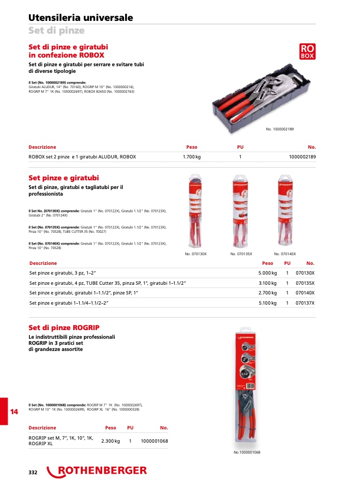 Il Set (No. 070140X) comprende: Giratubi 1“ (No. 070122X), Giratubi 1.1/2“ (No. 070123X),