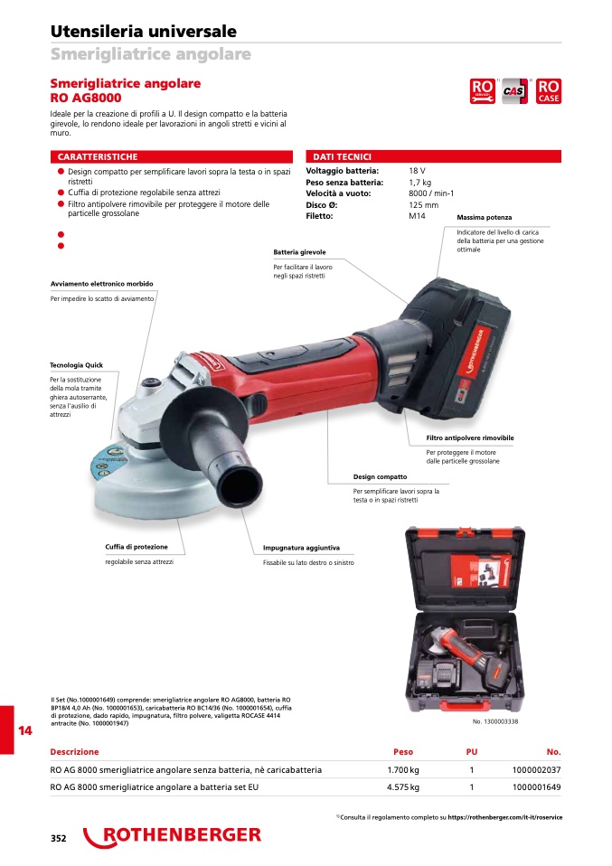 Il Set (No.1000001649) comprende: smerigliatrice angolare RO AG8000, batteria RO