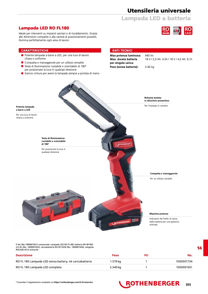 Il Set (No.1000001651) comprende: Lampada LED RO FL180, batteria RO BP18/2