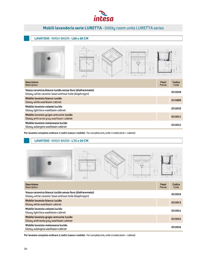 Per lavatoio completo ordinare 2 codici (vasca+mobile) • Forcompletesink,arder 2 codes(tank+ cabinet)