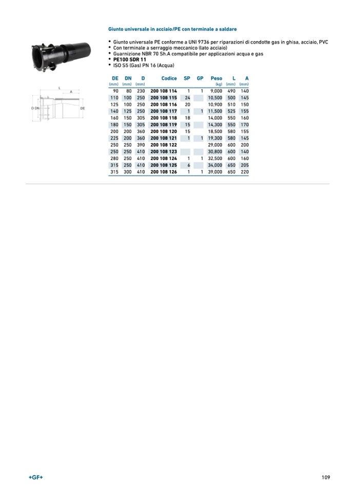 Giunto universale PE conforme a UNI 9736 per riparazioni di condotte gas in ghisa, acciaio, PVC