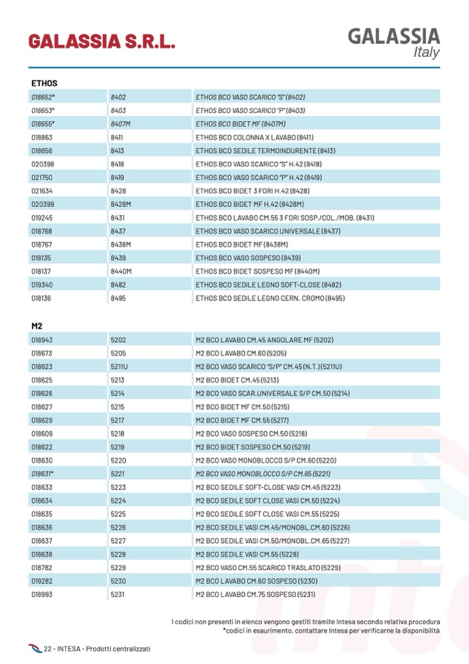 *codici in esaurimento, contattare Intesa per verificarne la disponibilità