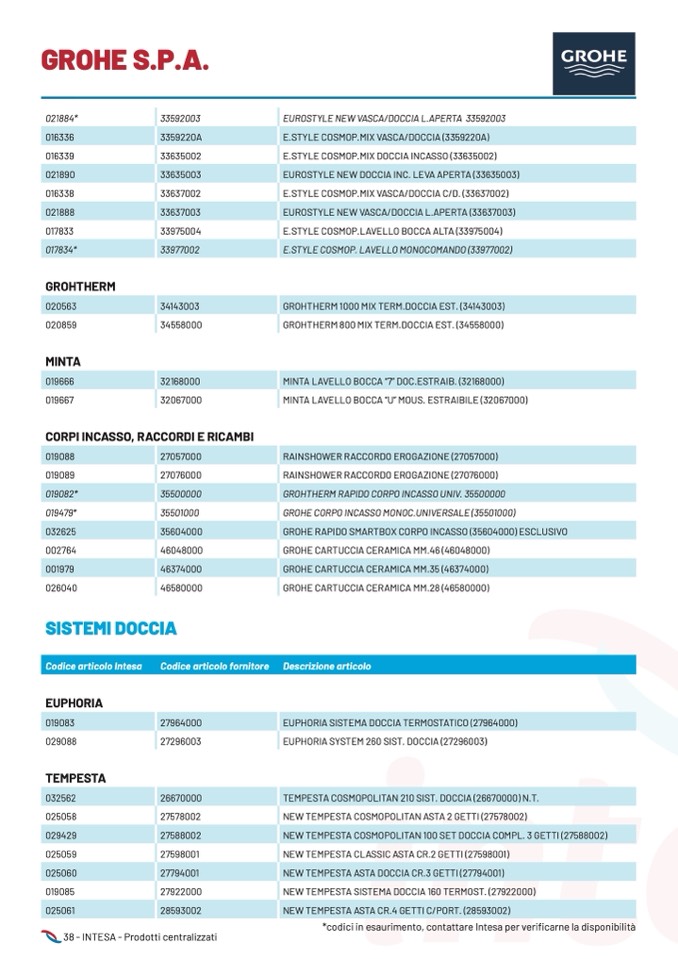 *codici in esaurimento, contattare Intesa per verificarne la disponibilità