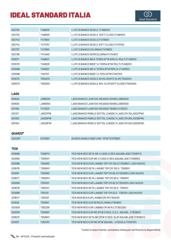 *codici in esaurimento, contattare Intesa per verificarne la disponibilità