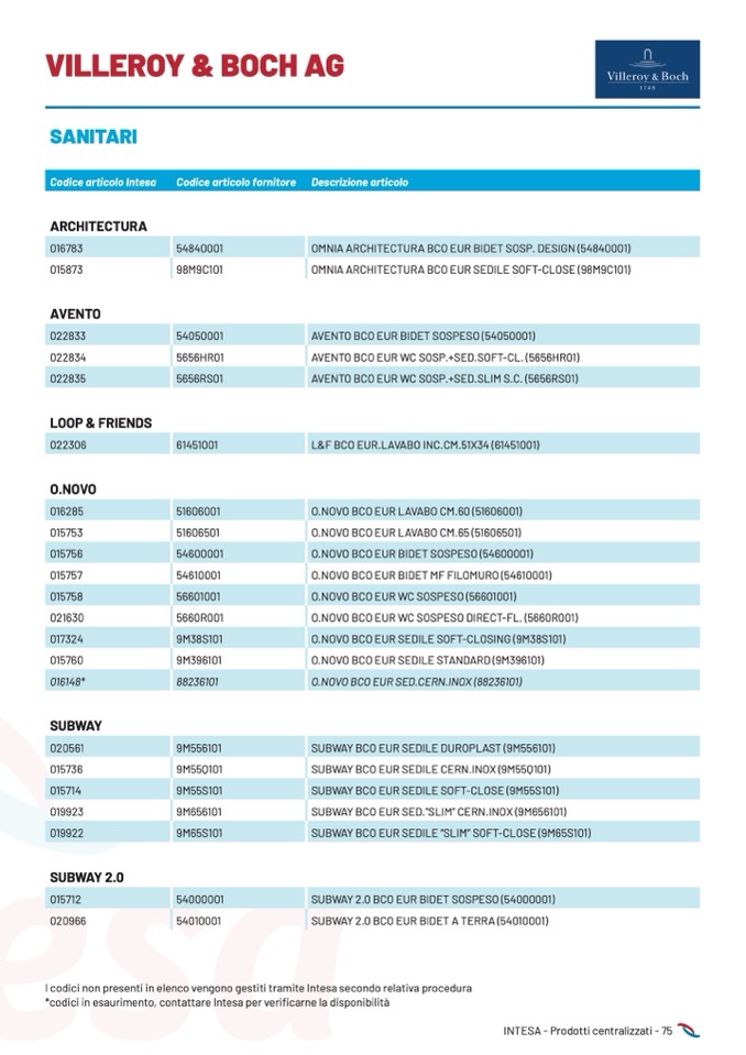 *codici in esaurimento, contattare Intesa per verificarne la disponibilità