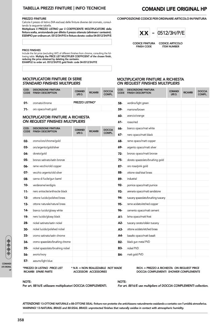 EXAMPLE to order art. 0512/3H/P/E gold finish: code 04-0512/3H/P/E