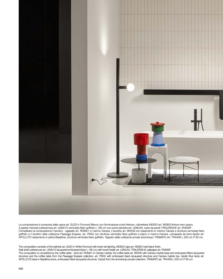 The composition consists of the bathtub art. SLED in White Flumood with lower led lighting, INDIGO taps art. ND903 matt black finish.