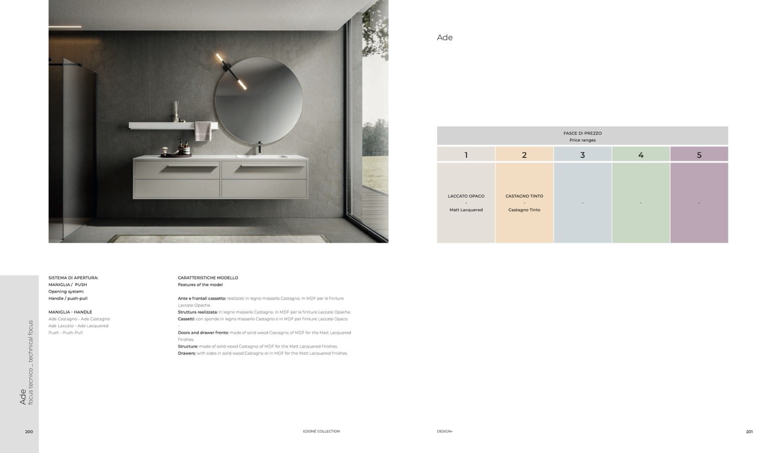 Struttura realizzata: in legno massello Castagno. In MDF per le finiture Laccate Opache.