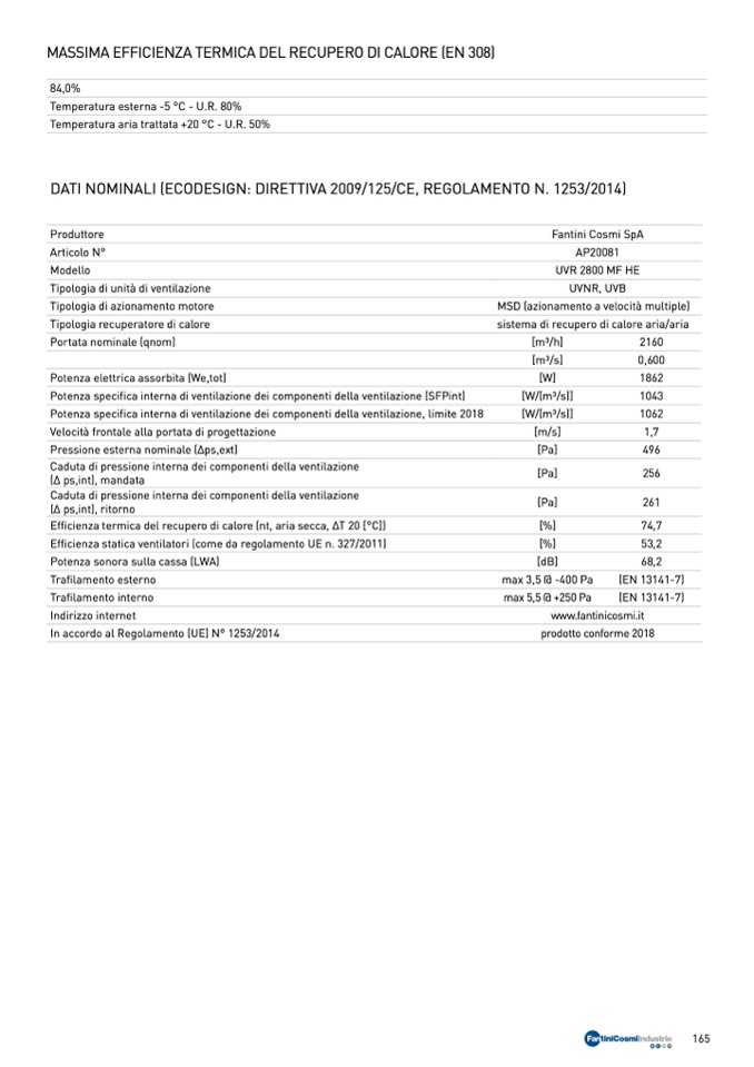 Efficienza statica ventilatori (come da regolamento UE n. 327/2011)