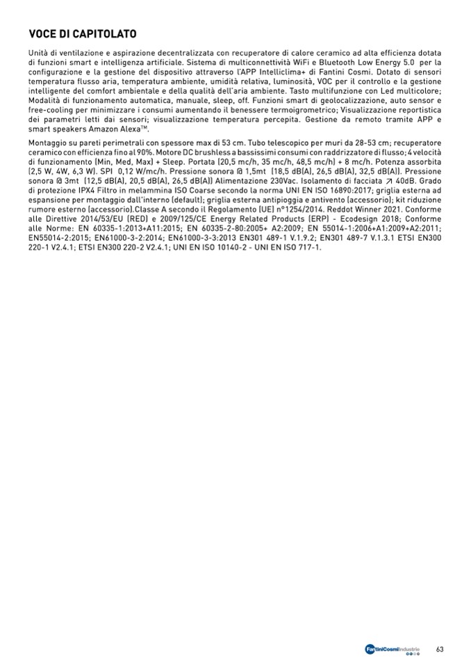 (2,5 W, 4W, 6,3 W). SPI 0,12 W/mc/h. Pressione sonora @ 1,5mt (18,5 dB(A), 26,5 dB(A), 32,5 dB(A)). Pressione