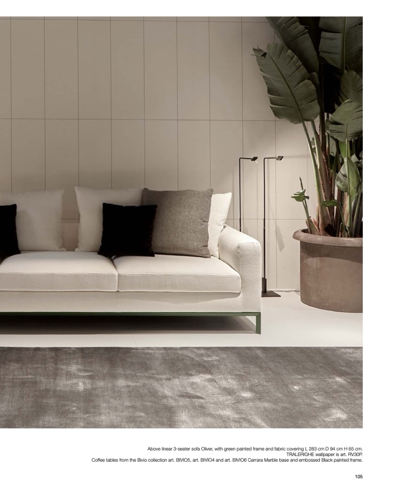 Above linear 3-seater sofa Oliver, with green painted frame and fabric covering L 283 cm D 94 cm H 65 cm.