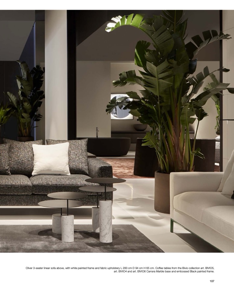 Oliver 3-seater linear sofa above, with white painted frame and fabric upholstery L 283 cm D 94 cm H 65 cm. Coffee tables from the Bivio collection art. BIVIO5,