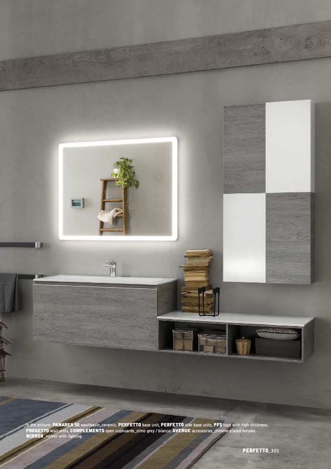 _in the picture: PANAREA 50 washbasin_ceramic. PERFETTO base unit, PERFETTO side base units, PFS tops with high thickness,