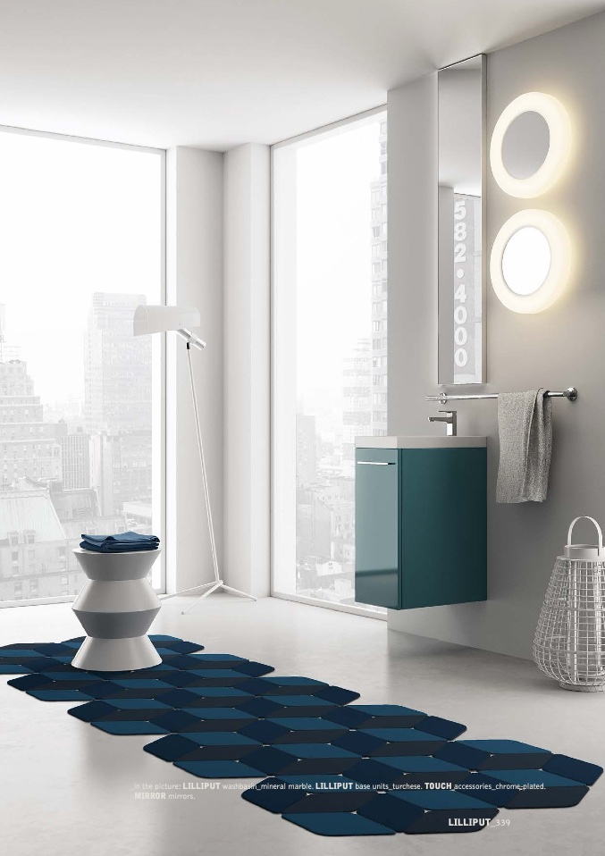 _in the picture: LILLIPUT washbasin_mineral marble. LILLIPUT base units_turchese. TOUCH accessories_chrome-plated.