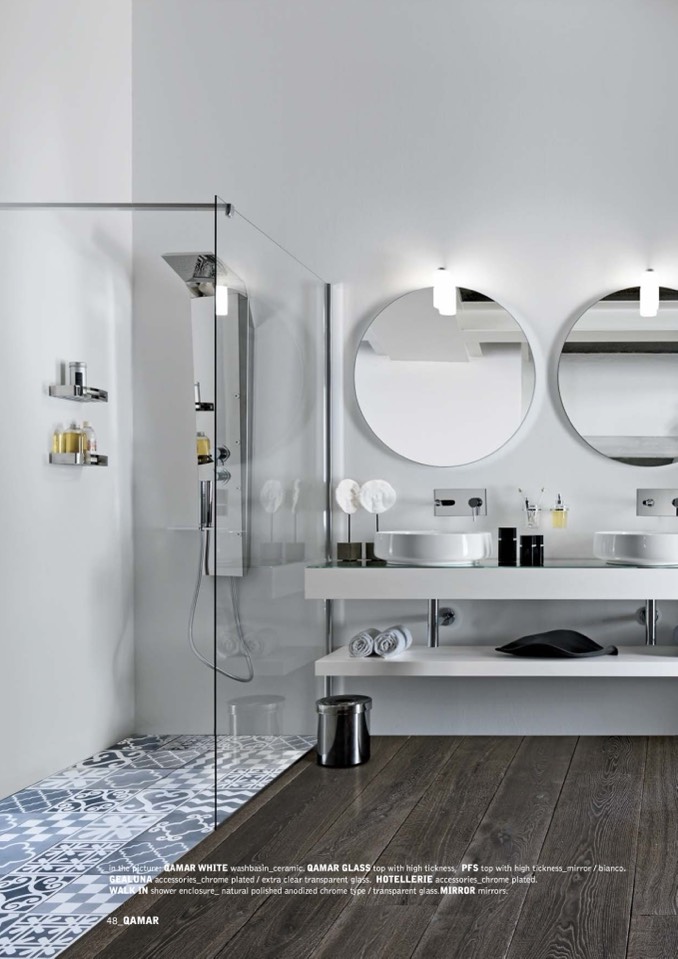 _in the picture: QAMAR WHITE washbasin_ceramic. QAMAR GLASS top with high tickness, PFS top with high tickness_mirror / bianco.