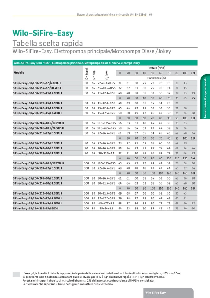L’area grigia inserita in tabella rappresenta la parte della curva caratteristica oltre il limite di selezione consigliato, NPSHr = 6.5m.