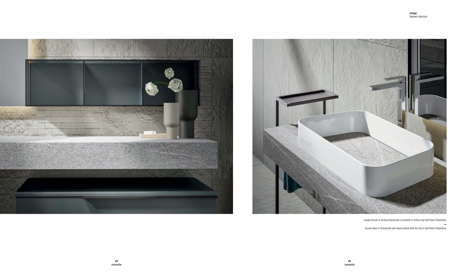 Lavabo Scudo in finitura Stonematt e tavoletta in finitura top Hpl Pietra Piasentina.
