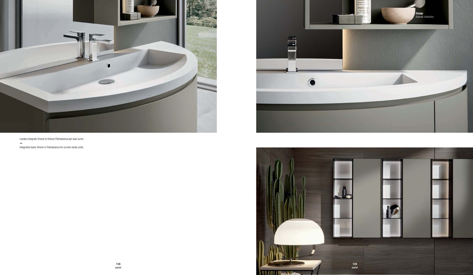 Integrated basin Orione in Pietrabianca for curved vanity units.
