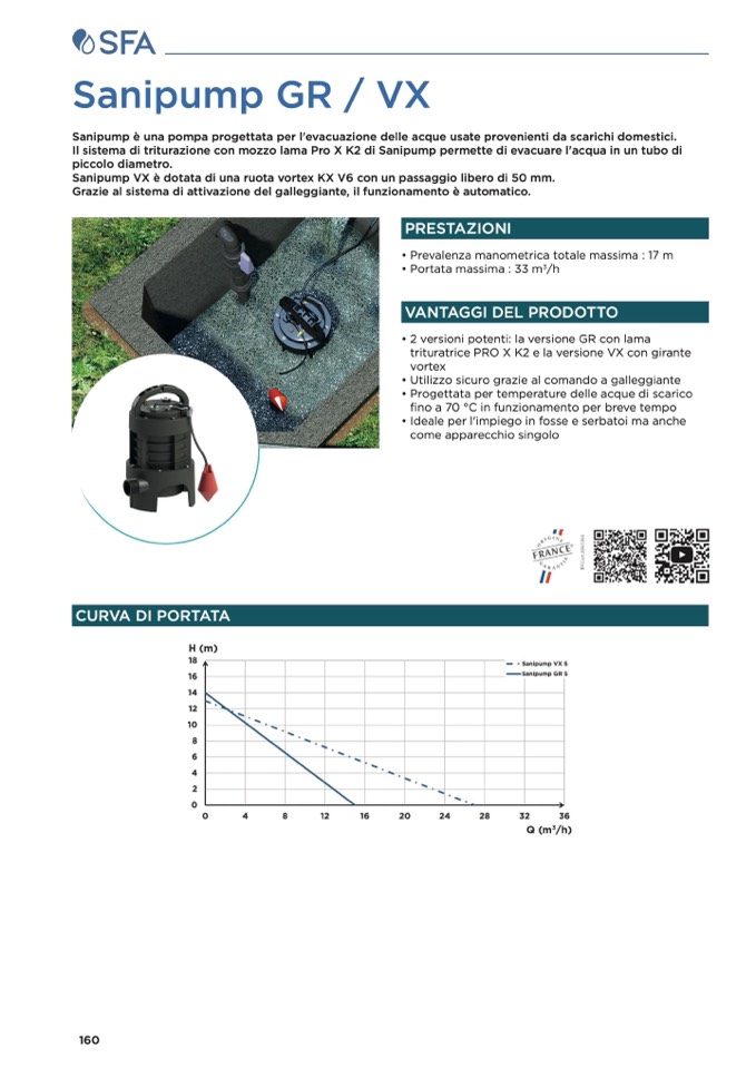 Sanipump VX è dotata di una ruota vortex KX V6 con un passaggio libero di 50 mm.