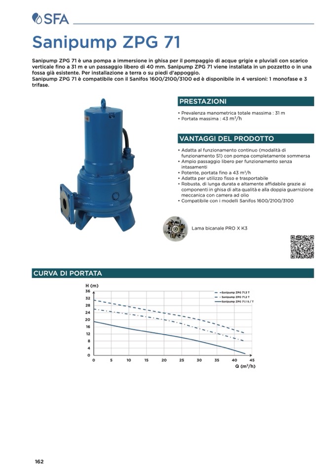 Sanipump ZPG 71 è compatibile con il Sanifos 1600/2100/3100 ed è disponibile in 4 versioni: 1 monofase e 3