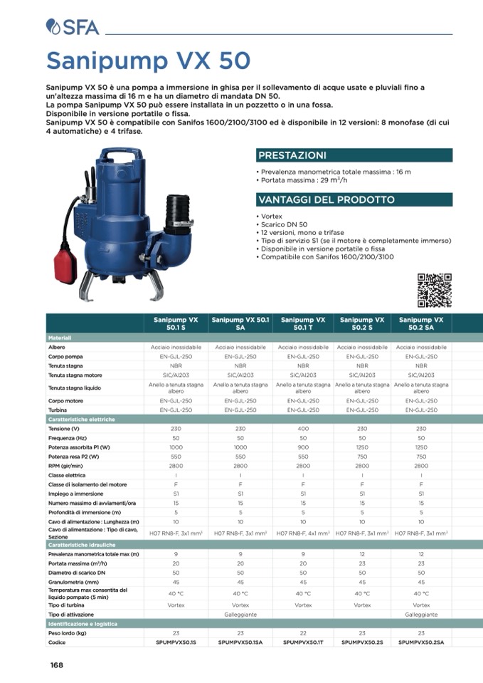 Sanipump VX 50 è compatibile con Sanifos 1600/2100/3100 ed è disponibile in 12 versioni: 8 monofase (di cui