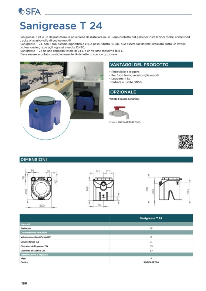 Sanigrease T 24 è un degrassatore in polietilene da installare in un luogo protetto dal gelo per installazioni mobili come food