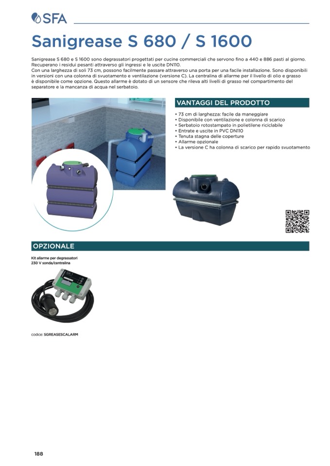 Sanigrease S 680 e S 1600 sono degrassatori progettati per cucine commerciali che servono fino a 440 e 886 pasti al giorno.