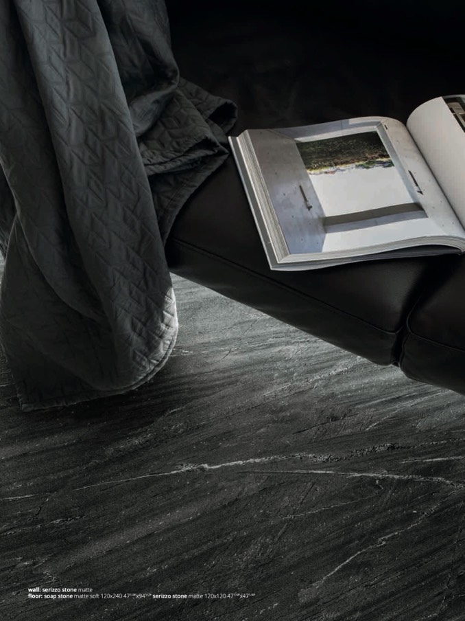 floor: soap stone matte soft 120x240 471/4”x941/2” serizzo stone matte 120x120 471/4”x471/4”