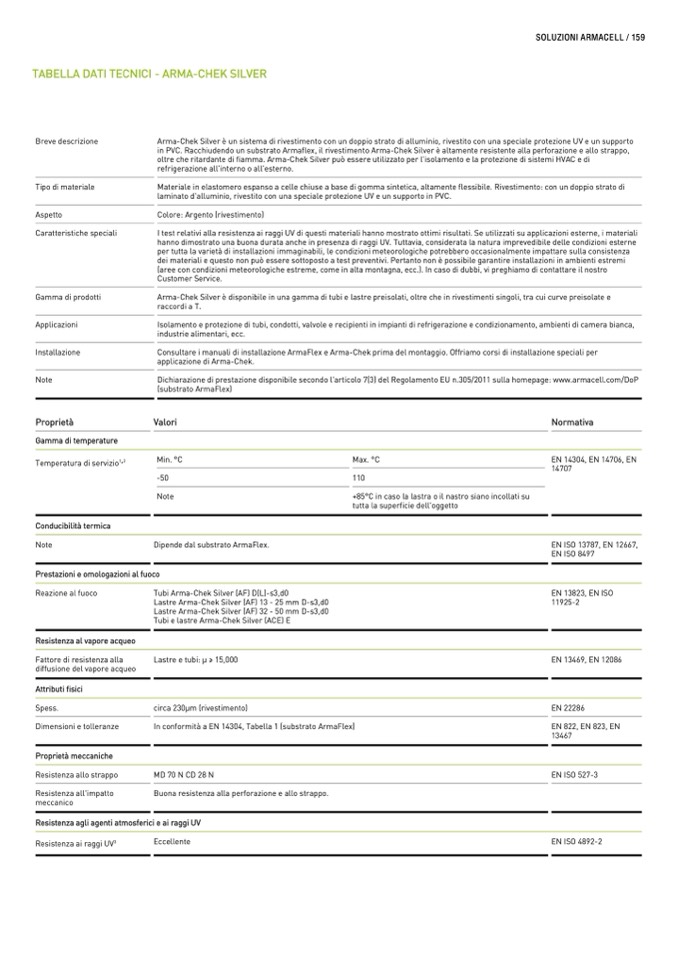 in PVC. Racchiudendo un substrato Armaflex, il rivestimento Arma-Chek Silver è altamente resistente alla perforazione e allo strappo,
