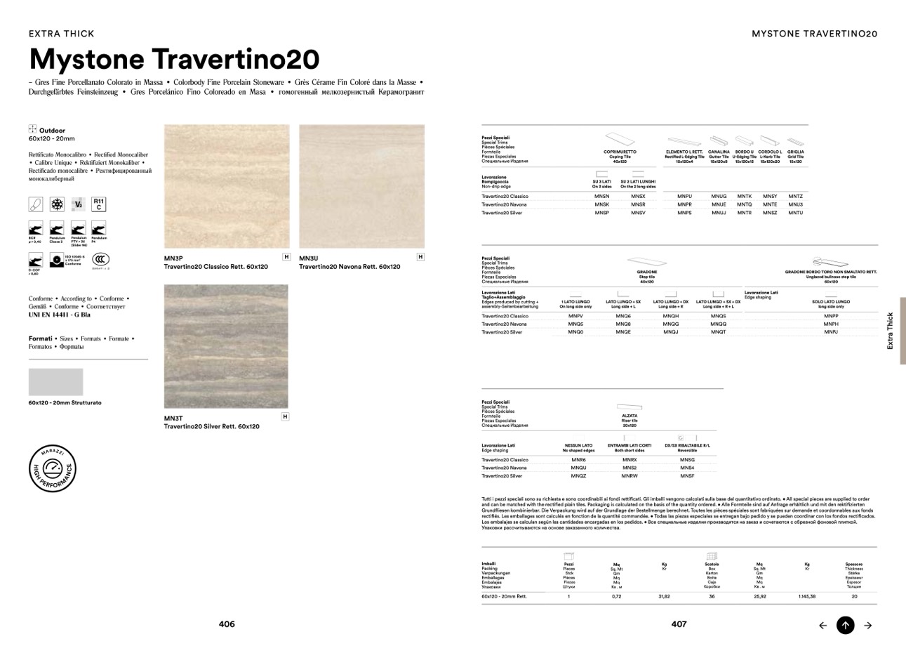Tutti i pezzi speciali sono su richiesta e sono coordinabili ai fondi rettificati. Gli imballi vengono calcolati sulla base del quantitativo ordinato. • All special pieces are supplied to order