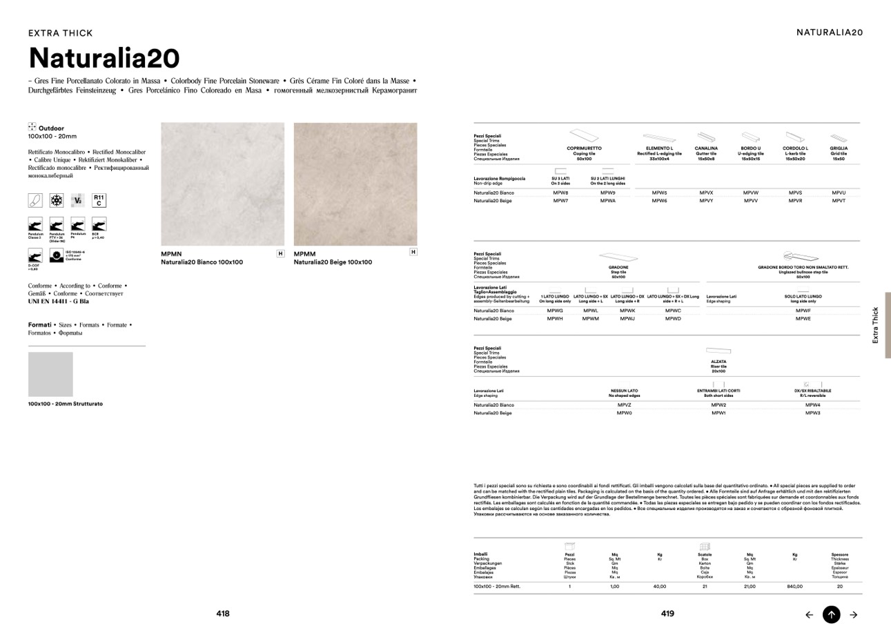 Tutti i pezzi speciali sono su richiesta e sono coordinabili ai fondi rettificati. Gli imballi vengono calcolati sulla base del quantitativo ordinato. • All special pieces are supplied to order