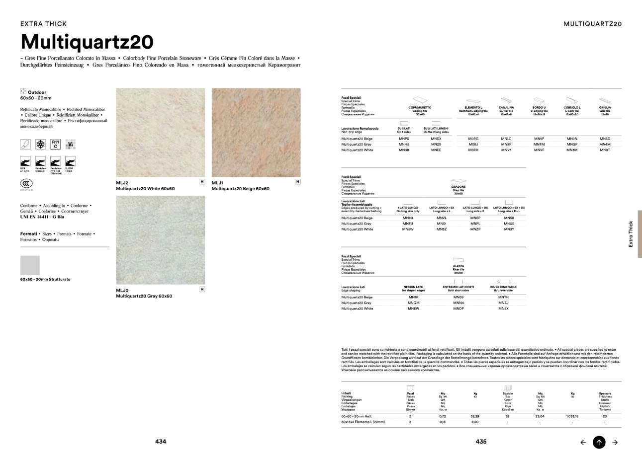 Tutti i pezzi speciali sono su richiesta e sono coordinabili ai fondi rettificati. Gli imballi vengono calcolati sulla base del quantitativo ordinato. • All special pieces are supplied to order