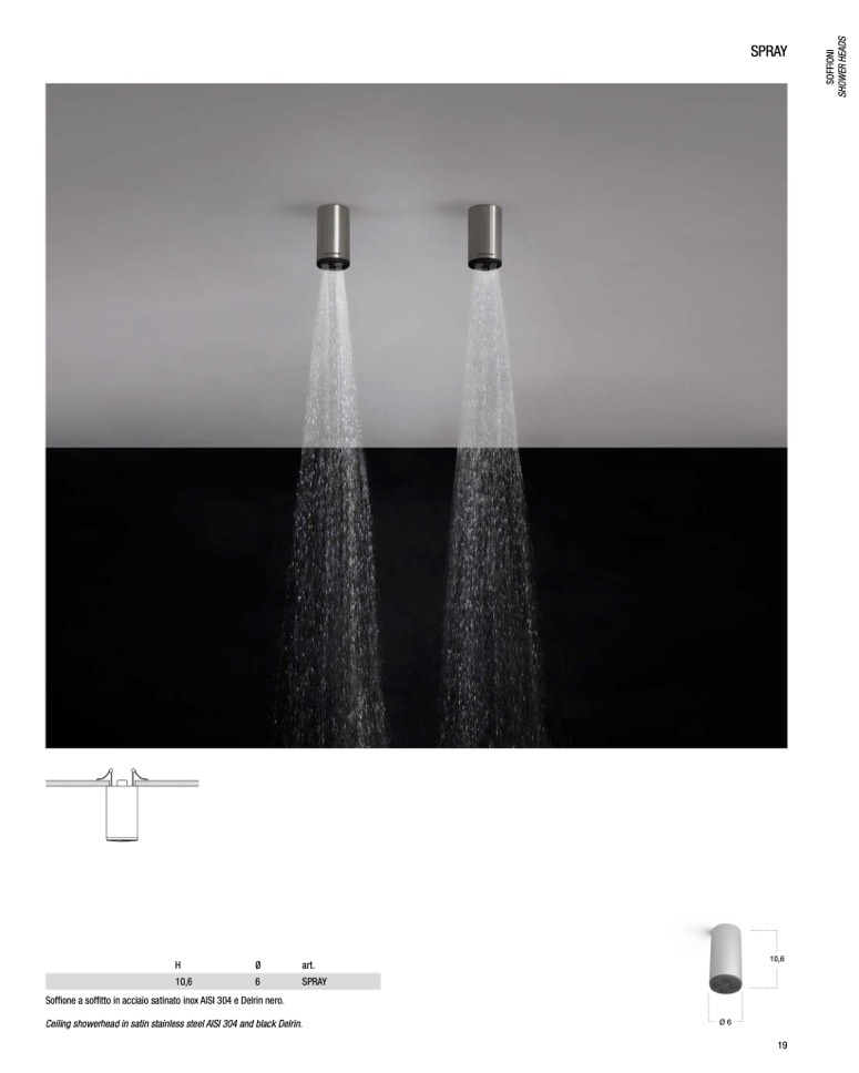 Ceiling showerhead in satin stainless steel AISI 304 and black Delrin.